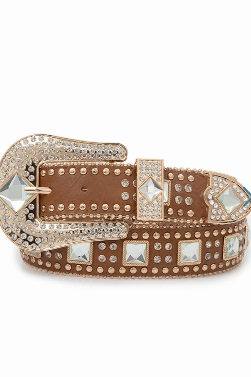 Cinto em couro com pedrarias, tamanho único, veste até manequim 46.